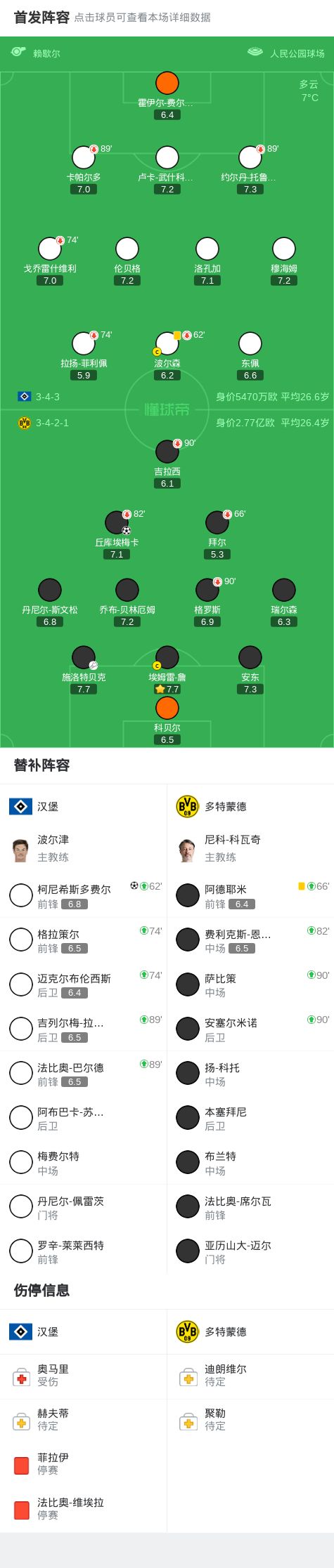 第90+7分钟,柯尼希斯多费尔最后时刻头球破门,汉堡1-1多特